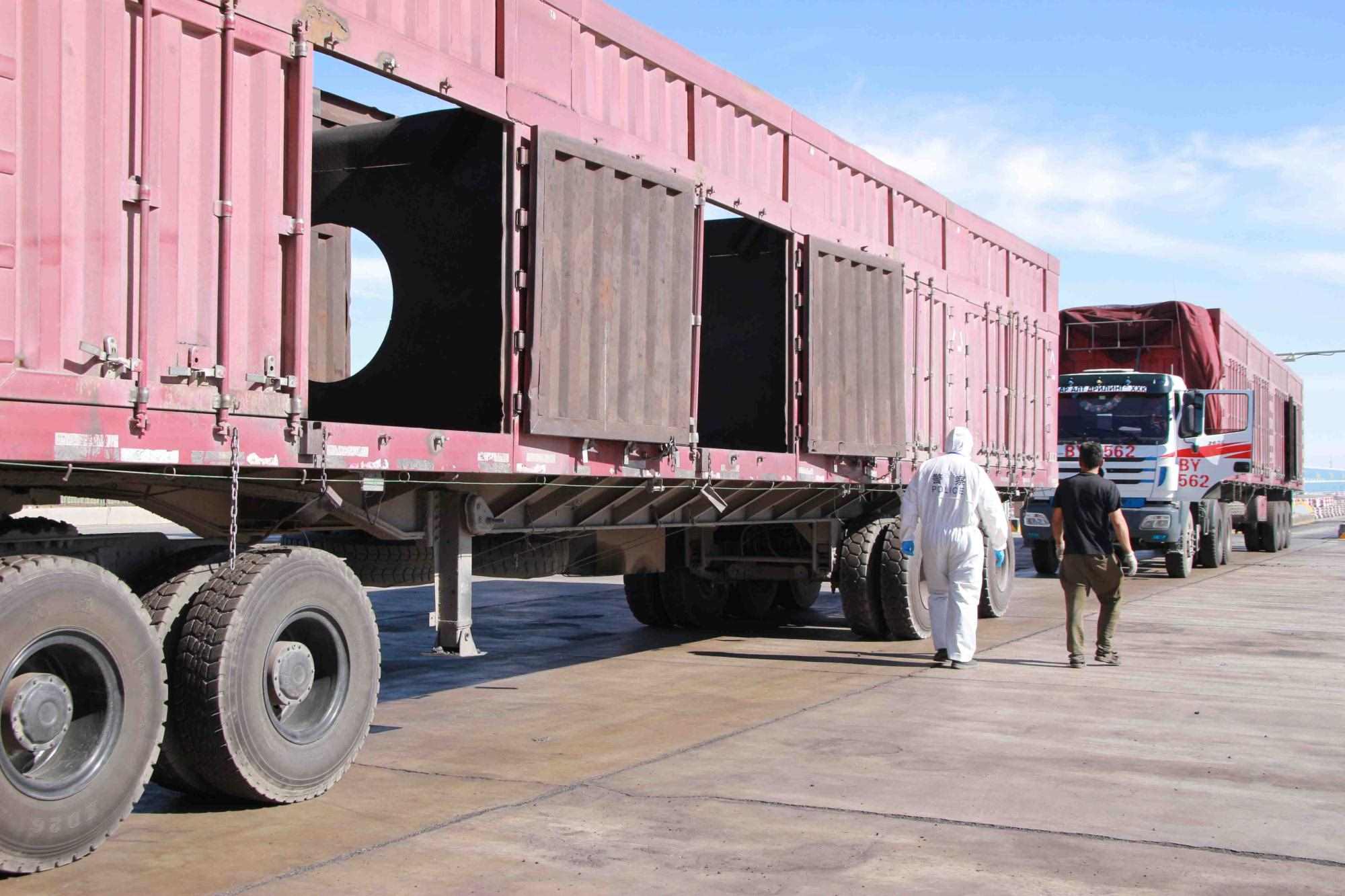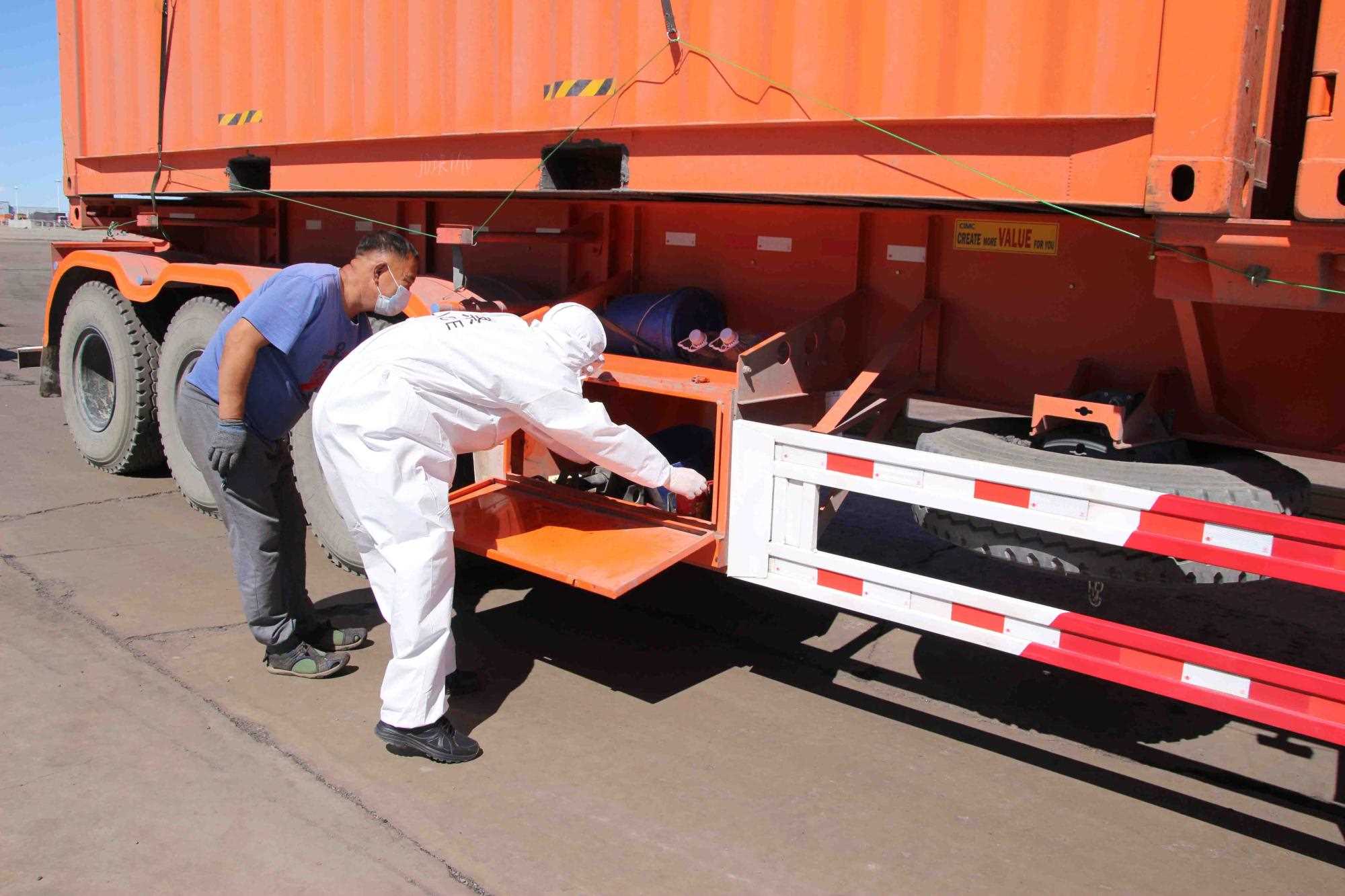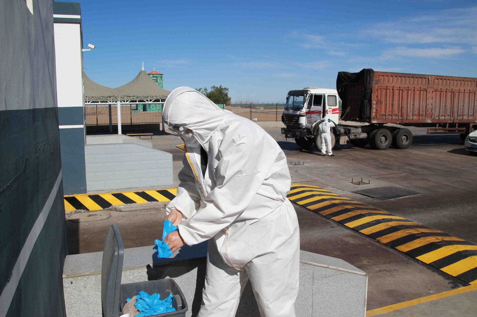 近期策克口岸的溫度持續(xù)增加至30攝氏度以上,而在通行的重型卡車,溫度還要更高,下午15點溫度計地表溫度測量最高可達(dá)40攝氏度。這無疑讓的查驗工作更為繁重。更重要的是,由于疫情影響每名民警在查驗期間都要穿上防護(hù)服,在高溫下,由于防護(hù)服是密閉的,防護(hù)服里仿佛成了蒸箱,用不了十分鐘,民警就會汗流浹背,防護(hù)服黏在身上又粘又癢,一班勤務(wù)近2個小時,必須要等過了勤務(wù)才能休息,而民警還要完成車體的查驗工作,包括工具箱、馬槽等處,絲毫不敢馬虎。