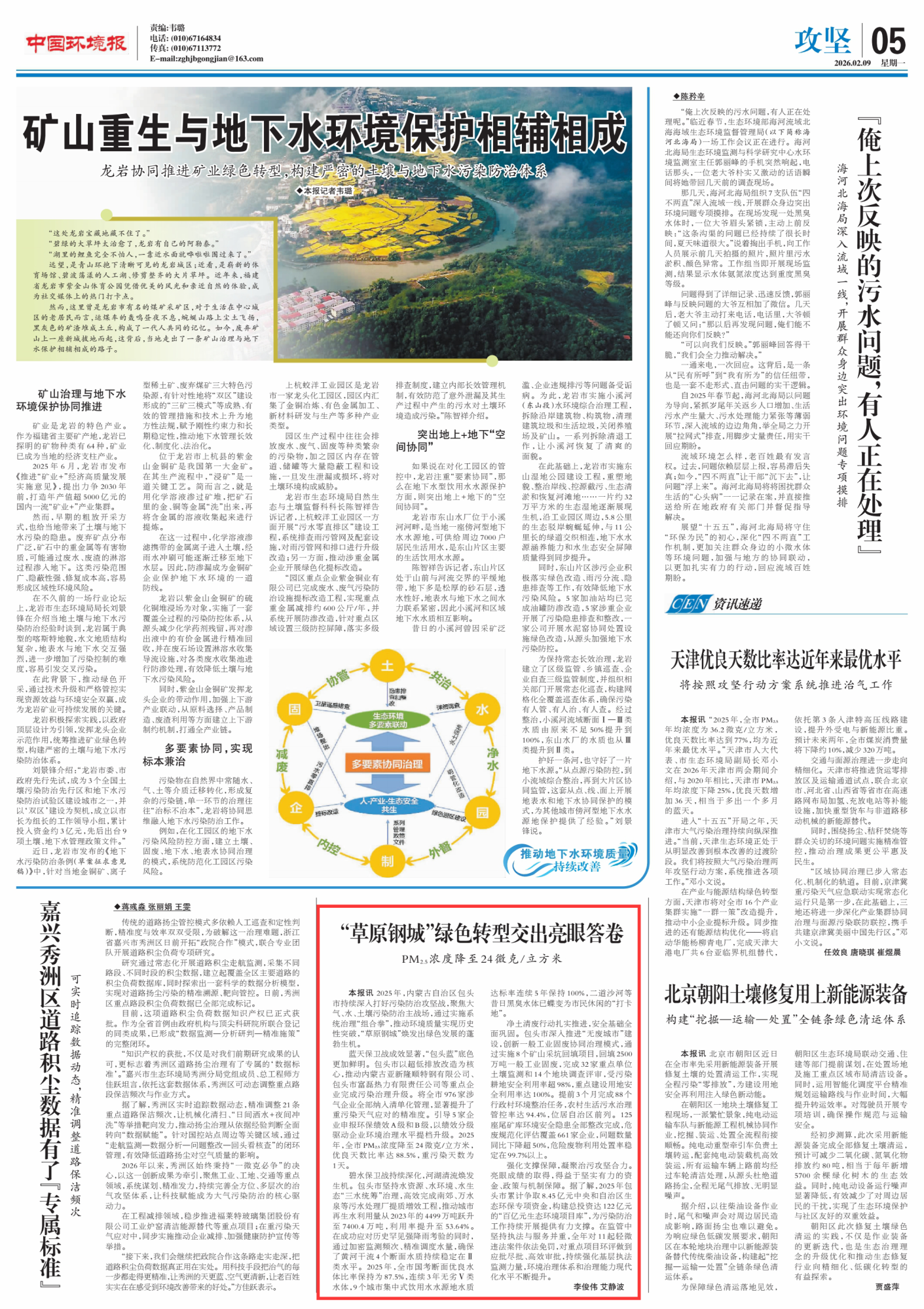 2026年2月9日,《中國環(huán)境報》第5版刊發(fā)題為《“草原鋼城”綠色轉(zhuǎn)型交出亮眼答卷 PM2.5濃度降至24微克/立方米》的文章,報道了2025年,內(nèi)蒙古自治區(qū)包頭市持續(xù)深入打好污染防治攻堅戰(zhàn),聚焦大氣、水、土壤污染防治主戰(zhàn)場,通過實施系統(tǒng)治理“組合拳”,推動環(huán)境質(zhì)量實現(xiàn)歷史性突破,“草原鋼城”煥發(fā)出綠色發(fā)展的蓬勃生機(jī)。
