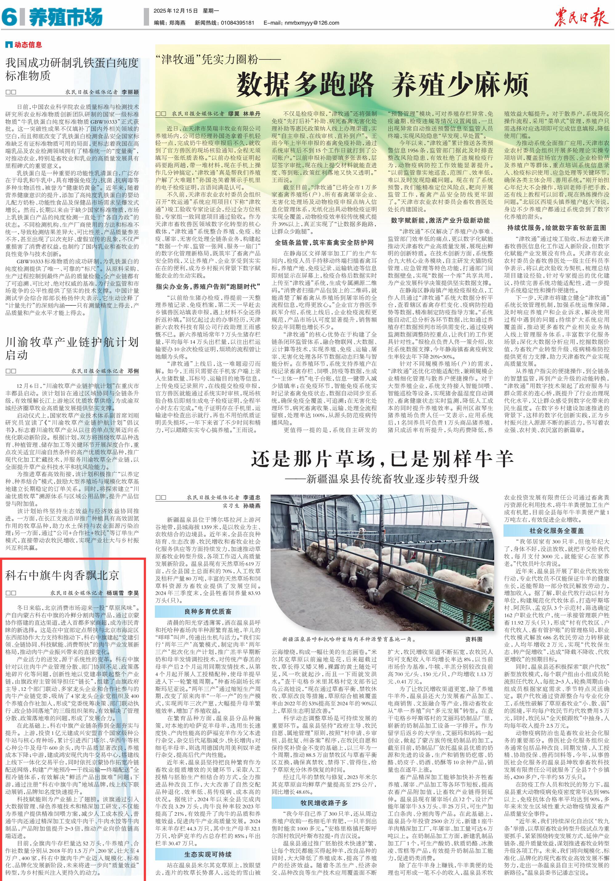 2025年12月15日《農(nóng)民日報》第6版刊發(fā)了《科右中旗牛肉香飄北京》的文章,報道了產(chǎn)自內(nèi)蒙古科右中旗的冷鮮分割肉等產(chǎn)品,通過京蒙協(xié)作搭建的直達(dá)渠道,進(jìn)入首都多家商超,成為市民青睞的新選擇。這是在中宣部定點(diǎn)幫扶與北京市海淀區(qū)東西部協(xié)作大力支持和推動下,科右中旗建起“黨建引領(lǐng)、全鏈協(xié)同、科技賦能、消費(fèi)幫扶”的肉牛產(chǎn)業(yè)發(fā)展新格局,為鄉(xiāng)村振興注入更持久的動力。