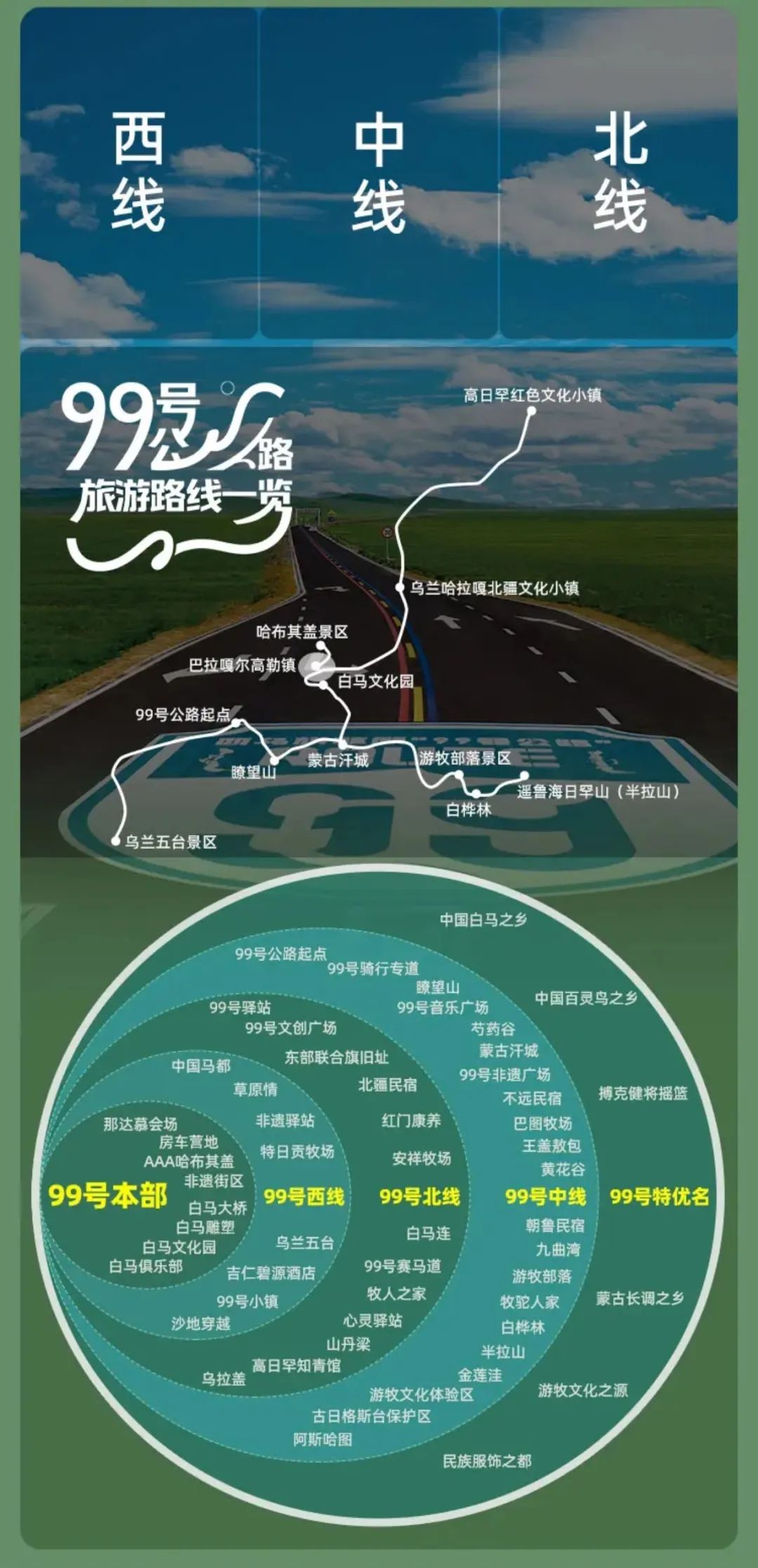 西烏旗草原“99號(hào)公路”分為西線、中線和北線