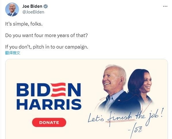 CNN注意到,在特朗普的直播結(jié)束后不久,美國總統(tǒng)拜登在社交媒體上發(fā)出了政治籌款呼吁,并配文稱,“很簡單,伙計(jì)們。 你還想再那樣過四年嗎?如果你不喜歡,請參與我們的競選活動?!?/p>
