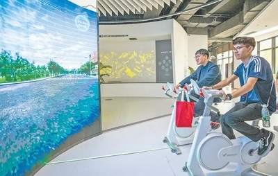 馬斯卡廷中學(xué)學(xué)生(右)體驗(yàn)VR單車(chē)雄安新區(qū)城市漫游項(xiàng)目。