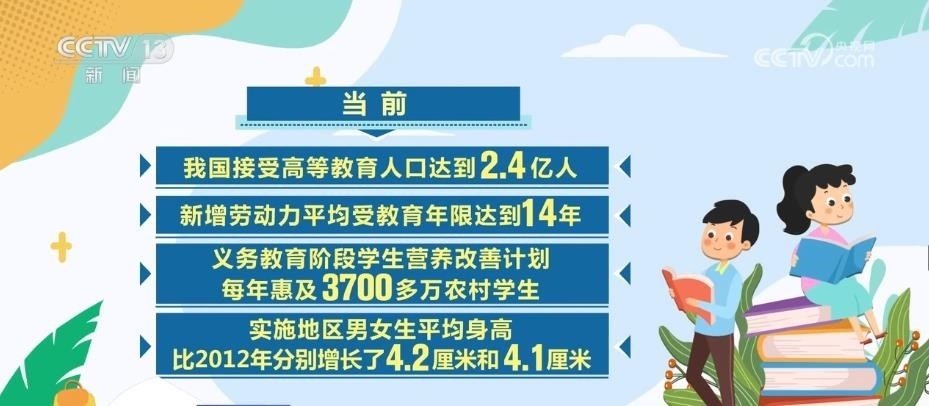 當(dāng)前,我國接受高等教育人口達(dá)到2.4億人,新增勞動(dòng)力平均受教育年限達(dá)到14年。義務(wù)教育階段學(xué)生營養(yǎng)改善計(jì)劃每年惠及3700多萬農(nóng)村學(xué)生,實(shí)施地區(qū)男女生平均身高比2012年分別增長了4.2厘米和4.1厘米。