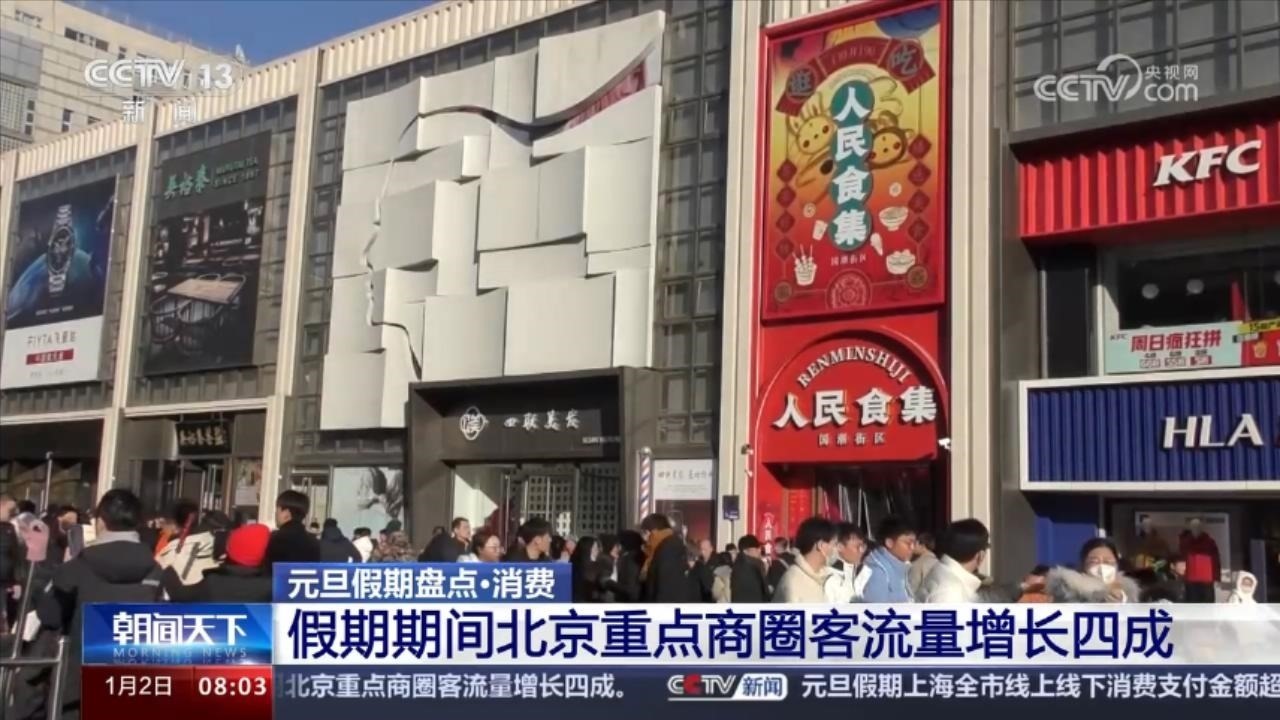元旦假期期間,北京市商務(wù)局重點(diǎn)監(jiān)測(cè)的百貨、超市、專業(yè)專賣店、餐飲和電商等業(yè)態(tài)企業(yè)實(shí)現(xiàn)銷售額25.1億元,餐飲消費(fèi)增勢(shì)強(qiáng)勁,同比增長(zhǎng)27.9%。北京全市60個(gè)重點(diǎn)商圈客流量2217.5萬(wàn)人次,同比增長(zhǎng)40.5%。