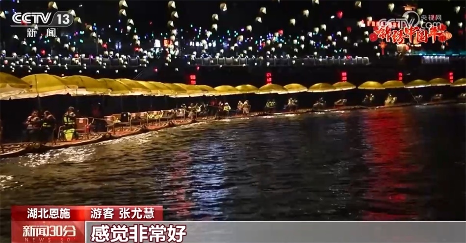 在湖北恩施,夜幕下的宣恩貢水河兩岸,各色花燈匯成燈的海洋,燈火璀璨、流光溢彩,非常喜慶熱鬧。各種“龍”元素出現(xiàn)在各個(gè)角落,特色美食配美景讓這座小城年味更加濃郁。