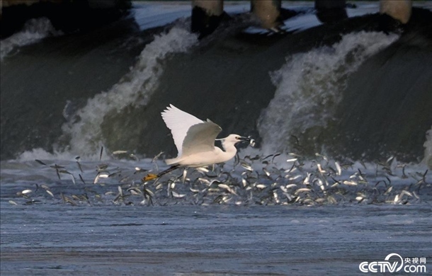 2024年4月9日,南京,秦淮河入江口,白鷺?biāo)姹P旋,捕食江中小魚。