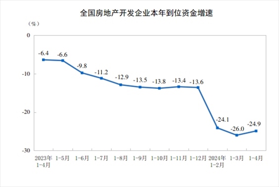 1—4月份,房地產(chǎn)開發(fā)企業(yè)到位資金34036億元,同比下降24.9%。其中,國(guó)內(nèi)貸款5583億元,下降10.1%;利用外資9億元,下降46.7%;自籌資金11736億元,下降10.1%;定金及預(yù)收款10002億元,下降37.2%;個(gè)人按揭貸款4953億元,下降39.7%。