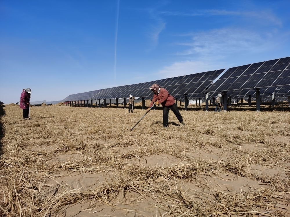 “光伏板可以遮陰,減少水分蒸發(fā)。板間空地上種上鄉(xiāng)土草和果樹,既能固沙,又能生產(chǎn)牲畜飼料和藥材、水果?!痹跒跆m布和沙漠85萬千瓦“光伏+生態(tài)治理”項目現(xiàn)場,磴口縣防沙治沙局副局長何文強介紹說,該項目的光伏板間距為12米、板下高度為1.8米,空間足夠灌木、草等植物生長,建成后草方格中將種植梭梭等耐旱植物,并在此基礎上發(fā)展肉蓯蓉等特色種植、養(yǎng)殖項目,從而實現(xiàn)生態(tài)建設、新能源開發(fā)、特色產(chǎn)業(yè)發(fā)展共贏。