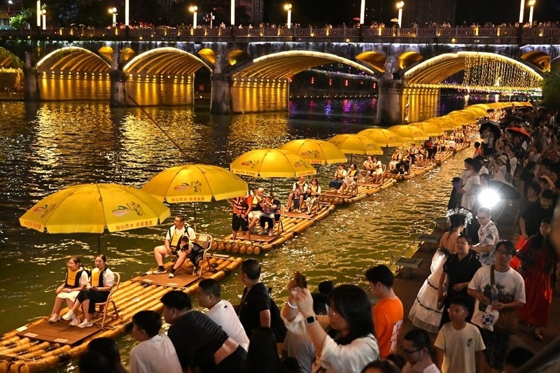 7月24日,游客在湖北省宣恩縣城貢水河上乘坐竹筏游玩賞景。