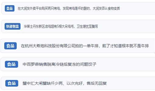 “人民投訴”上不少網(wǎng)友反映,“外賣商家銷售排骨套餐中含過期飲料”“外賣店鋪吃出蟑螂,商家不按照食品安全法賠償” “直播間購買車?yán)遄?,虛假宣?J、原裝進(jìn)口,到貨嚴(yán)重貨不對板”“網(wǎng)購東北珍珠貢米,到貨包裝上執(zhí)行標(biāo)準(zhǔn)是廢止的標(biāo)準(zhǔn)”“超市買的梅花肉切開發(fā)現(xiàn)是淋巴肉”“平臺(tái)商家承諾枸杞不熏硫酸,實(shí)則檢測后含硫超標(biāo)”“知名便利店售賣脫離冷鏈后多次復(fù)凍的餃子”等。
