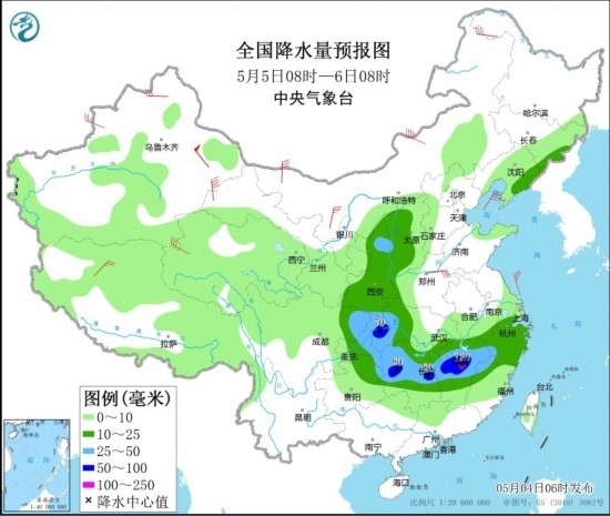 5月4日08時(shí)至5日08時(shí),湖北南部和東部、安徽南部、湖南東北部、江西中北部、浙江西部、江蘇南部以及山東半島、遼寧南部、河北東部等地部分地區(qū)有大到暴雨,其中,安徽南部、江西北部等地部分地區(qū)有大暴雨(100~120毫米)。上述部分地區(qū)伴有短時(shí)強(qiáng)降水(最大小時(shí)降雨量20~40毫米,局地可超過50毫米),局地有雷暴大風(fēng)等強(qiáng)對(duì)流天氣。內(nèi)蒙古中部、黑龍江東北部、新疆南疆盆地、甘肅河西、山東半島等地部分地區(qū)有4~6級(jí)風(fēng),其中,新疆東部部分地區(qū)有8~9級(jí)風(fēng)。渤海、渤海海峽、黃海大部、東海北部海域?qū)⒂?~8級(jí)、陣風(fēng)9~10級(jí)的大風(fēng)。