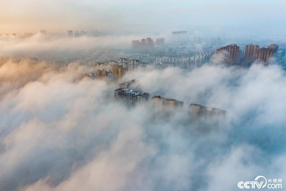 2023年6月11日,江蘇連云港東海縣,城市上空云霧繚繞,蔚為壯觀。