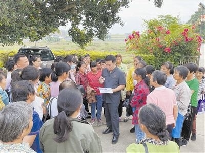“法治屋場(chǎng)會(huì)”上,法院黨員志愿服務(wù)隊(duì)在給種植戶普及法律知識(shí)。