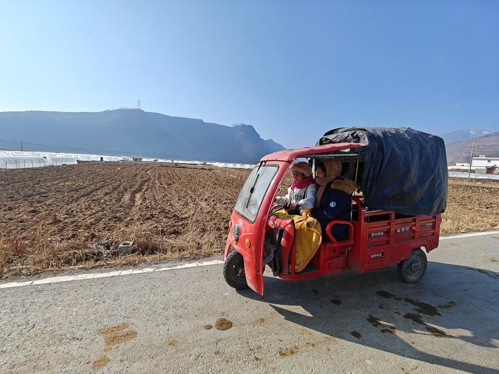巴木和大女兒騎著三輪車,經(jīng)過(guò)烤煙育苗大棚。新華社記者 謝佼 攝