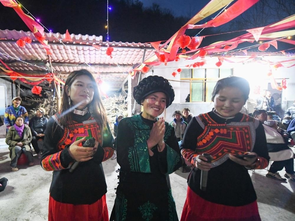 2月2日,巴木玉布木(中)和侄女巫其小冰(左)、大女兒巫其拉布木一起唱歌。新華社記者 王曦 攝