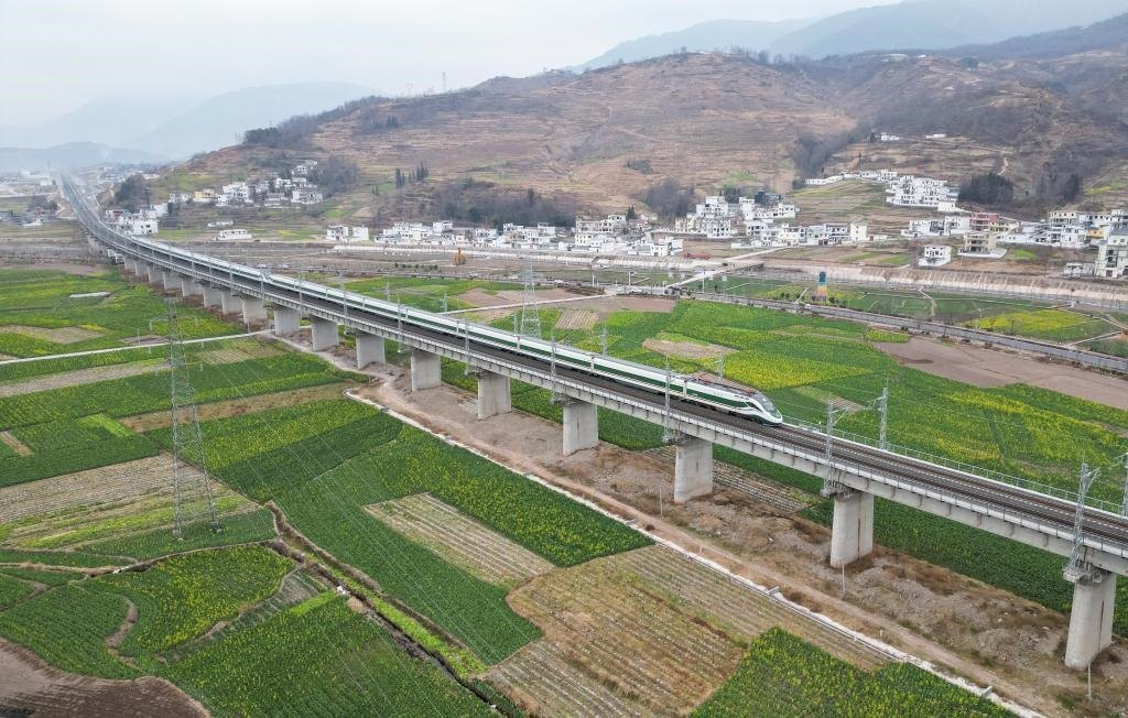 這是2月3日,一趟列車通過(guò)越西縣城郊(無(wú)人機(jī)照片)。新華社記者 王曦 攝