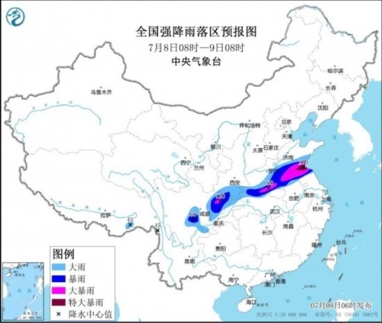 全國(guó)強(qiáng)降水落區(qū)預(yù)報(bào)(7月8日08時(shí)-9日08時(shí))
