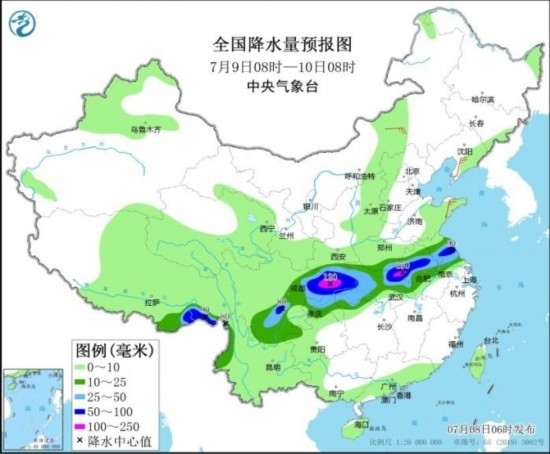 全國(guó)降水量預(yù)報(bào)圖(7月9日08時(shí)-10日08時(shí))