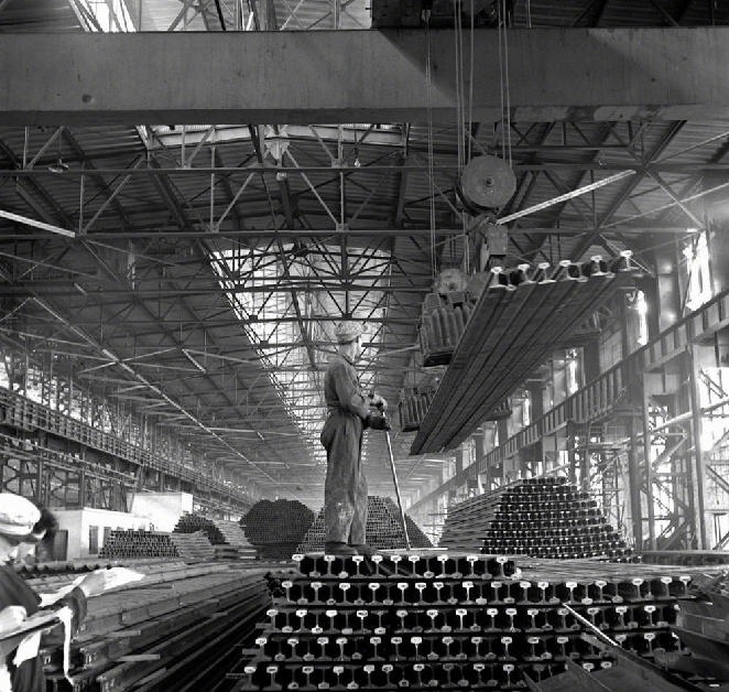 “一五”期間,鞍鋼興建的第一座大型軋鋼廠生產(chǎn)能力已迅速超過設(shè)計(jì)標(biāo)準(zhǔn)。這是這個廠生產(chǎn)的大批鋼軌(攝于1957年4月)。