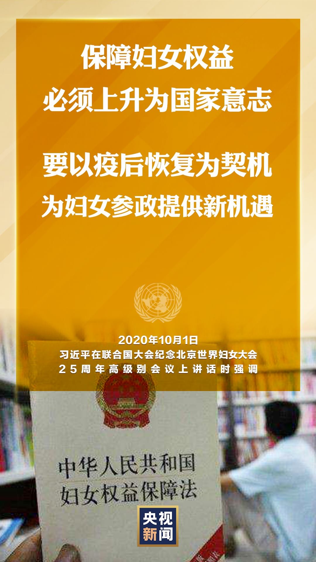國家主席習(xí)近平10月1日在聯(lián)合國大會紀(jì)念北京世界婦女大會25周年高級別會議上通過視頻發(fā)表重要講話。就如何切實保護(hù)婦女權(quán)益,習(xí)近平提出中國主張。