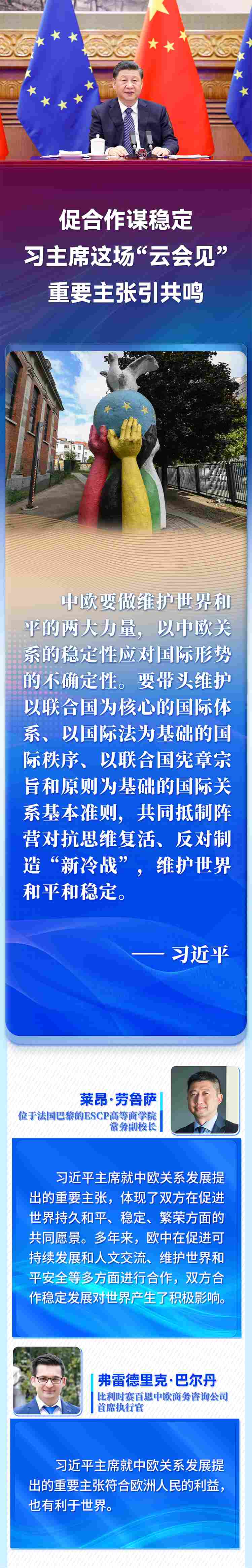 國家主席習(xí)近平4月1日晚在北京以視頻方式會(huì)見歐洲理事會(huì)主席米歇爾和歐盟委員會(huì)主席馮德萊恩。歐洲多國人士高度評(píng)價(jià)習(xí)近平主席就中歐關(guān)系、烏克蘭危機(jī)等問題提出的重要主張,認(rèn)為會(huì)晤為雙方關(guān)系持續(xù)健康發(fā)展作出戰(zhàn)略引領(lǐng),為復(fù)雜動(dòng)蕩的國際局勢(shì)注入穩(wěn)定性。