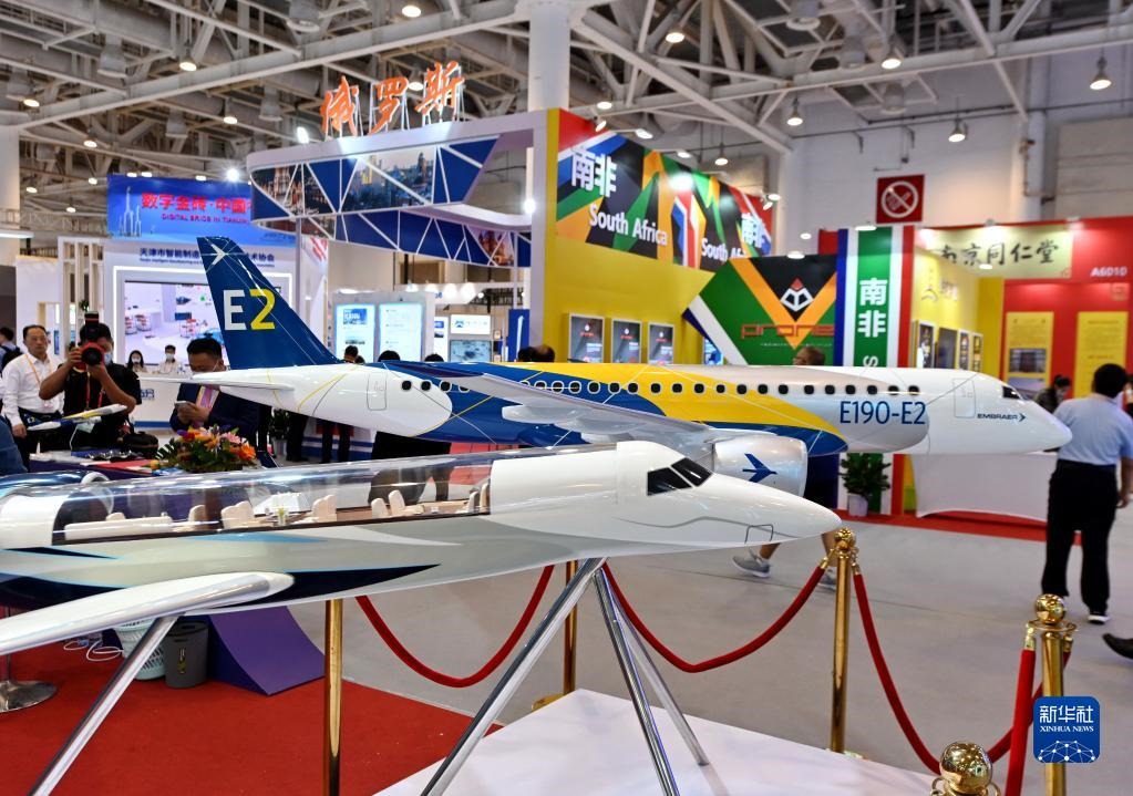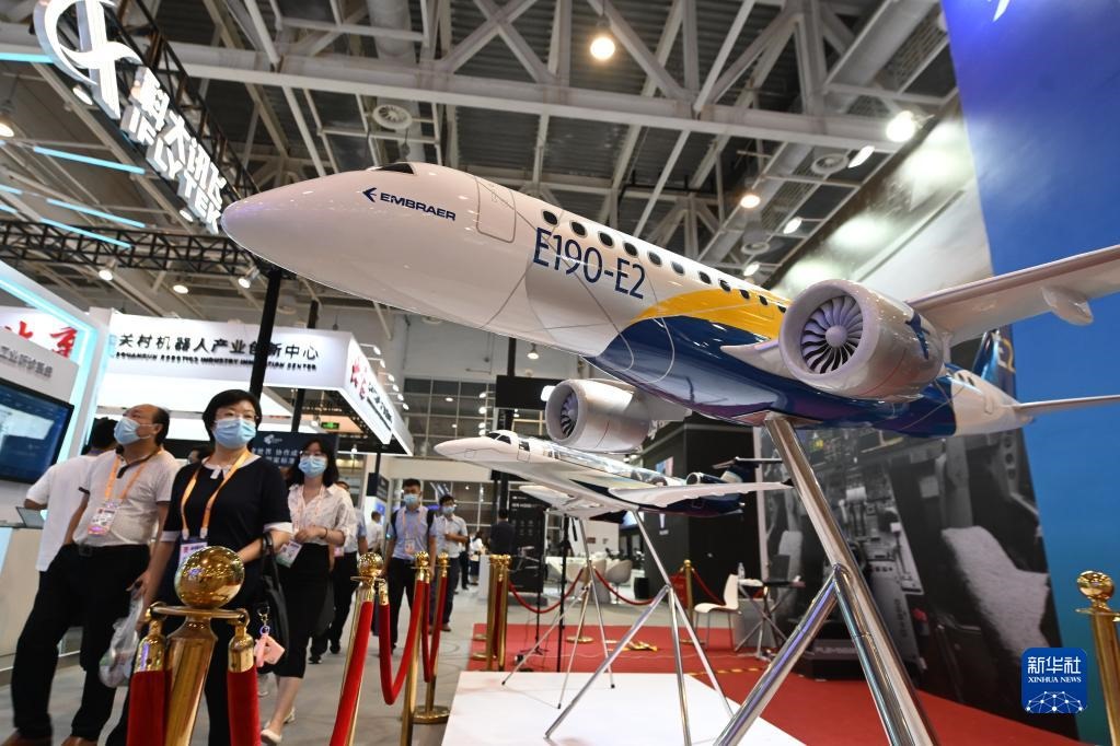 參觀者從2021金磚國(guó)家新工業(yè)革命展展出的飛機(jī)模型前走過(2021年9月8日攝)。新華社記者林善傳攝