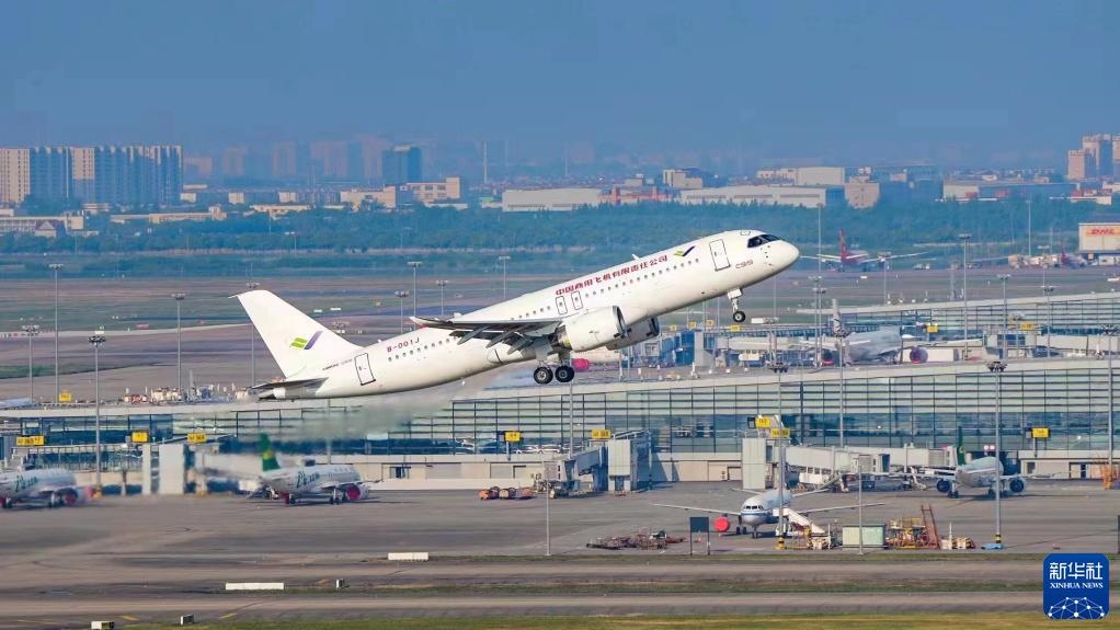 2022年5月14日6時52分,編號為B-001J的C919大飛機從上海浦東機場第4跑道起飛,于9時54分安全降落,標(biāo)志著中國商飛公司即將交付首家用戶的首架C919大飛機首次飛行試驗圓滿完成。新華社發(fā)