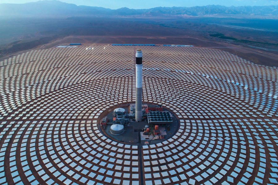 這是2018年6月7日在摩洛哥瓦爾扎扎特拍攝的努奧光熱電站項目三期工程(航拍照片)。從2015年起,中國電建集團下屬的山東電建三公司在瓦爾扎扎特承建努奧光熱電站項目二期和三期工程。努奧光熱電站為超過百萬的摩洛哥家庭提供清潔能源。