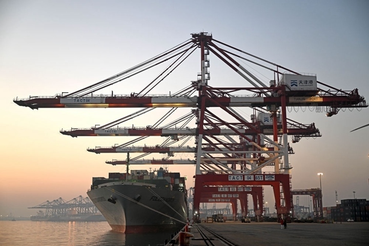 一艘貨輪靠泊在天津港聯(lián)盟國際集裝箱碼頭進(jìn)行裝卸作業(yè)(2023年1月1日攝)。新華社記者 趙子碩 攝