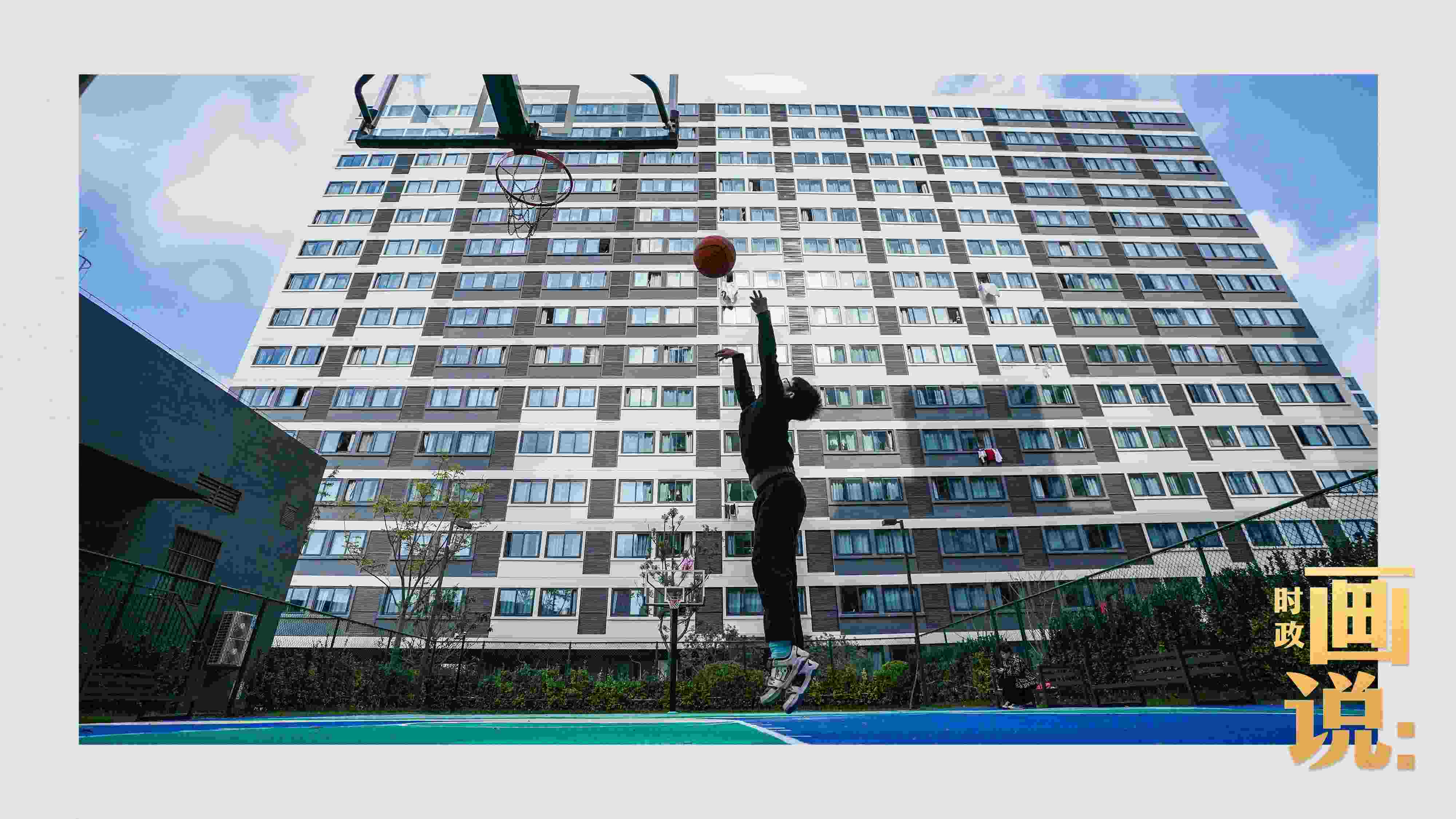 △社區(qū)籃球場上練習(xí)投籃的小男孩。閔行區(qū)新時(shí)代城市建設(shè)者管理者之家所在的社區(qū)是上海市首批大型保障性租賃住房項(xiàng)目之一,為許多來滬新市民、青年人和一線務(wù)工人員提供住房保障。閔行區(qū),上海。