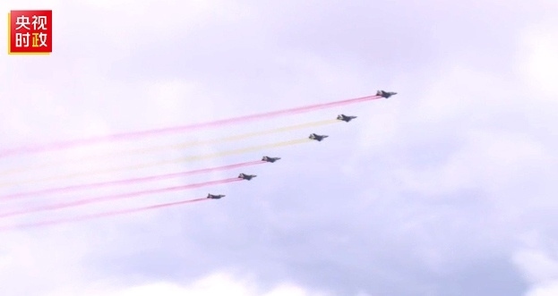 習(xí)近平主席車隊抵達哈薩克斯坦總統(tǒng)府時,六架哈薩克斯坦空軍戰(zhàn)機從總統(tǒng)府上空飛過,拉出象征中國國旗的紅黃色彩帶,以最高禮儀歡迎習(xí)近平主席。