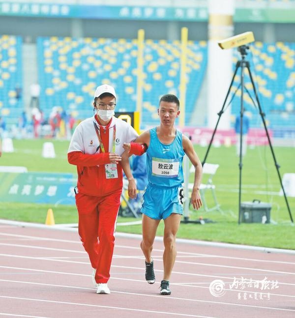 志愿者攙扶內(nèi)蒙古殘疾人運(yùn)動(dòng)員敖云波。