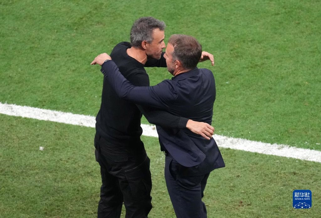 11月27日,德國隊(duì)主教練漢斯·弗利克(右)與西班牙隊(duì)主教練路易斯·恩里克在比賽后相互致意。新華社記者 陳誠 攝