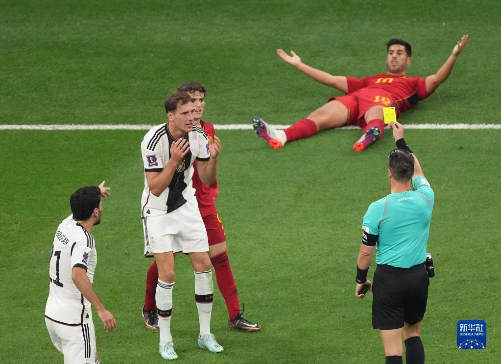 11月27日,主裁判在比賽中向德國隊(duì)球員萊昂·格雷茨卡(左二)出示黃牌。新華社記者 陳誠 攝