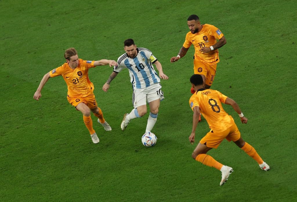 12月9日,阿根廷隊球員梅西(左二)在對荷蘭隊的比賽中進攻。新華社記者 潘昱龍 攝