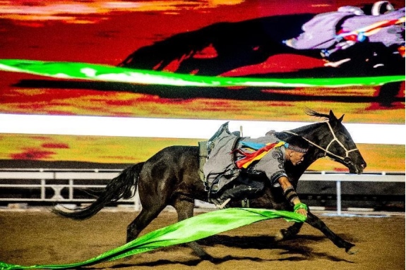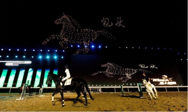 開幕式文體表演由《馬術(shù)方陣一馬當(dāng)先》、歌伴舞《我的城我的馬》、《名馬展示策馬揚(yáng)鞭》、《單馬技巧雙翼神馬》、《馬障礙秀躍馬揚(yáng)鞭》、《馬術(shù)秀人馬合一》、歌伴舞《騎跡包頭》、《無(wú)人機(jī)秀馬上精彩》八塊內(nèi)容組成。當(dāng)晚的賽汗塔拉馬術(shù)賽場(chǎng)流光溢彩、氣氛熱烈,場(chǎng)內(nèi)座無(wú)虛席、歡聲雷動(dòng)。20時(shí)30分許,主騎手手持國(guó)旗,副騎手手持馬城旗幟,運(yùn)動(dòng)員方陣、民族方陣、女騎方陣、馬主方陣入場(chǎng),騎手們精神飽滿、英姿颯爽,不時(shí)揮手致意,現(xiàn)場(chǎng)觀眾用熱烈的掌聲和歡呼聲,歡迎他們的到來(lái)。達(dá)茂旗9歲賽馬冠軍阿茹樂手持彩旗引出世界名馬亮相,40對(duì)人馬合一的“千古馬頌”表演震撼全場(chǎng),1000架無(wú)人機(jī)躍然天空,點(diǎn)亮“騎跡包頭 馬上精彩”的字樣……藍(lán)天、碧水、凈土的包頭在策馬奔騰的馬術(shù)競(jìng)技中拉開了“中國(guó)馬城”的壯麗畫卷。