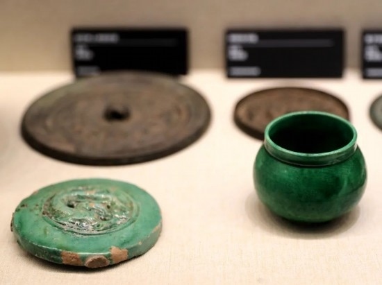 前排左:綠釉龍紋瓦當(dāng) 金代 首都博物館藏;前排右:定窯綠釉矮領(lǐng)罐 金代 中國民族博物館藏。(民族畫報記者 鷹鴿 攝)