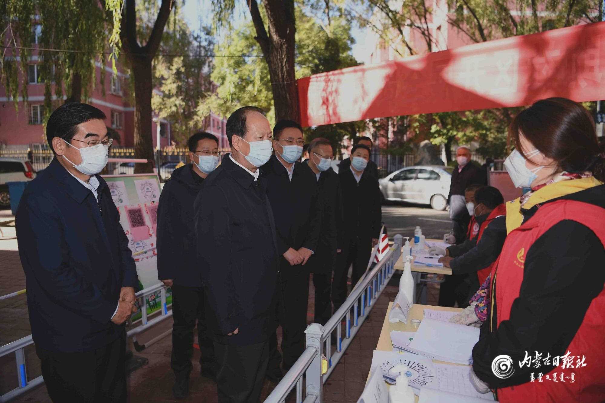 10月26日,自治區(qū)黨委書記、人大常委會(huì)主任石泰峰在學(xué)府花園小區(qū),檢查入口健康碼查驗(yàn)、體溫檢測(cè)、值班值守等情況,并來到核酸檢測(cè)采樣點(diǎn),仔細(xì)察看采樣登記流程。內(nèi)蒙古日?qǐng)?bào)社融媒體記者 袁永紅 攝