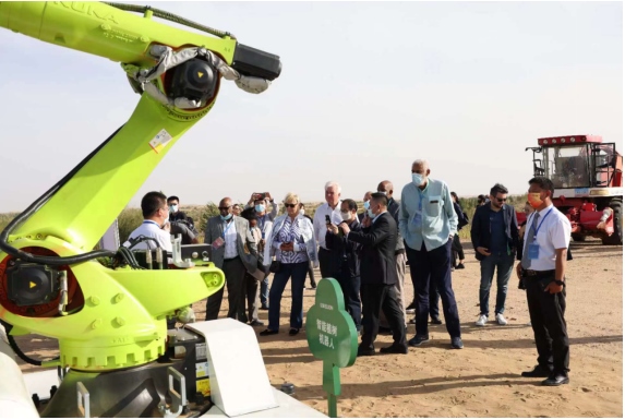 第八屆庫(kù)布其國(guó)際沙漠論壇上,外國(guó)嘉賓觀摩億利集團(tuán)機(jī)器人植樹。