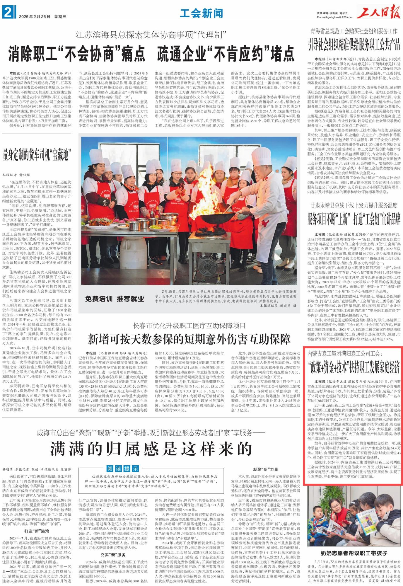 2025年2月26日,《工人日報》第2版刊發(fā)題為《內(nèi)蒙古森工集團(tuán)滿歸森工公司工會:“政策+資金+技術(shù)”扶持職工發(fā)展家庭經(jīng)濟(jì)》的消息,介紹了近年來,內(nèi)蒙古森工集團(tuán)滿歸森工公司工會打出“政策+資金+技術(shù)”組合拳,鼓勵職工通過種植食用菌增加收入。