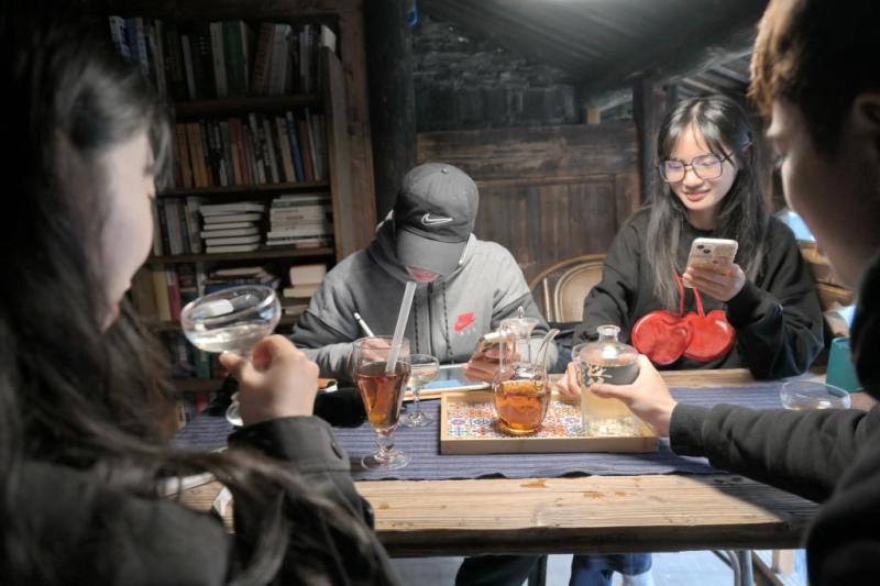 2024年4月9日,年輕消費(fèi)者在福鼎白琳老街“同順泰”茶號(hào)品嘗新式茶飲料。新華社記者 林善傳 攝