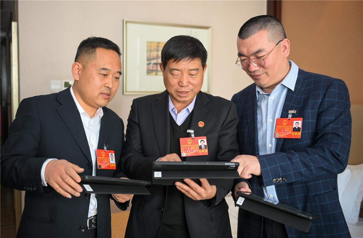 出席自治區(qū)十四屆人大二次會議的人大代表丁慧杰(左)、李?。ㄖ校?、石海認真研讀會議材料。
